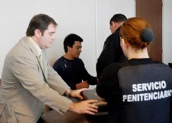 | El abogado Marcelo Martín Silvano y detrás su defendido Cristian Zalazar, junto a personal de la cárcel villamariense |