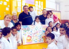 | Buen gesto. Integrantes de la Peña Pasión Boquense posan con alumnos y autoridades de la Escuela Mitre. |