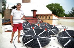 Explicarlo parece fácil: el agua sale del fondo de la pileta impulsada por una bomba a través de un caño por el que sube hasta el techo donde están, a manera de serpentina, los 370 metros de otro tipo de caño de polietileno negro (absorve más el calor) por donde circula el agua a razón de 1.200 litros por hora, calentándose por el efecto del sol para volver a la pileta. “Logramos que tenga unos seis grados más, lo que le permite tener la temperatura justa para que no te dé esa sensación de frío cuando entrás a darte un chapuzón, pero que te alcanza para refrescarte”.