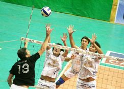 | A pasarla. Vizzari trata de cruzar la pelota frente al bloqueo rival (foto gentileza Diario de Cuyo) |