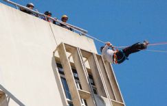 En el techo del edificio que ocupa el Poder Judicial, en calle General Paz al 300, un grupo de bomberos ensayaba operaciones de rescate con el debido equipamiento de seguridad.