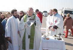 | Casas, a la izquierda de la imagen, junto a Darío Falcone (cura misionero que regresó ya a su Italia natal) por entonces a cargo de la parroquia de Alicia y Fortín. Ambos participaron junto a otros tres sacerdotes del Decanato de una misa en el corte |